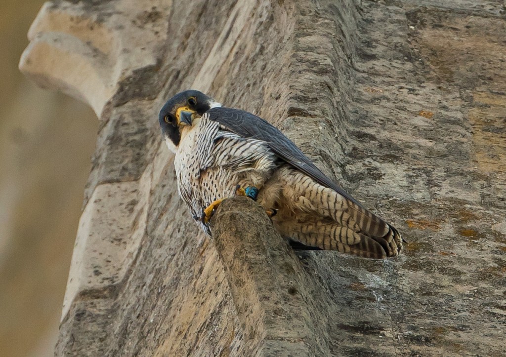 I’m lucky enough to work in a building next to a spire that until Thursday had been home to a pair of peregrine falcons. The tiercel, the male falcon known as Norm, is still there but sadly the female, GA, named from the letters on her leg ring, collided with a stationary car on Thursday morning and died that night.