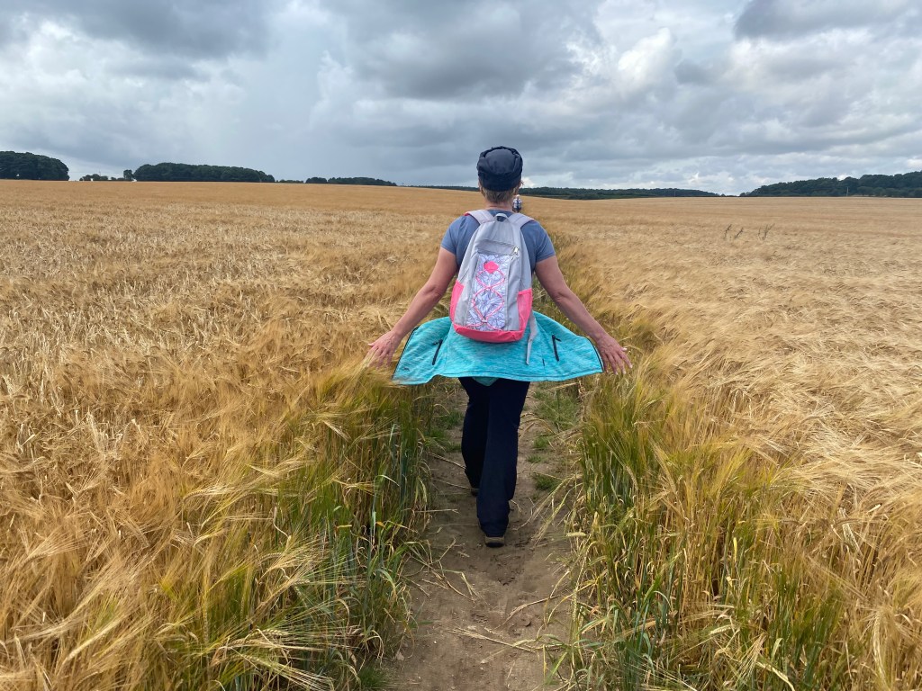 Where the footpaths meet, ignore the very inviting path to right and turn left and then right, to a fabulous path which the farmer had very kindly marked out so well, that led across the unharvested field.
