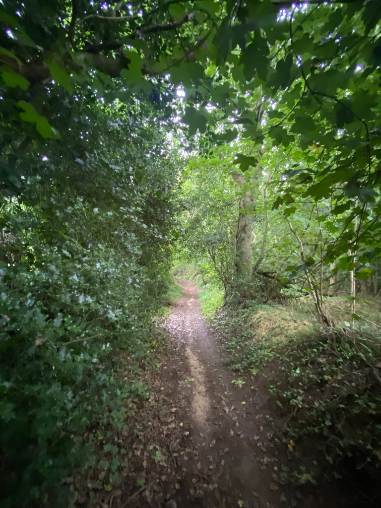 This is a lovely part of the walk on a hot day. The trees offer dappled shade and as the path levels off, you catch the glimpse of blue sea across the fields.