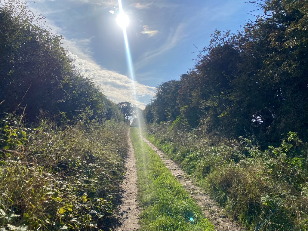This is a lovely, easy walking track. The fields are glorious to the left and the surface is very easy to walk on. It was a sunny autumnal day when we did this walk and the light was that diffused golden and very beautiful. There were still blackberries to be eaten and butterflies flitting around and the hedges were alive with birds.