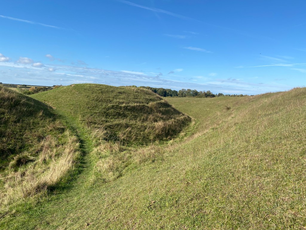 Follow Cockleshell Drove as it hurries between fields. There are some lovely views to the left and right as you walk along this lane. Keep walking until you come to a road. Pass over a road and the lane becomes tarmac. Follow this (now called Stiffkey Road) until you come into the village of Warham. You can, if you are weak and have no love of history, turn right and continue on the path. If, however, you still have the sense you are born with, go straight across this junction, past the little church, up the hill, down the hill, over the bridge and then up the other side of the hill. Keep an eye out for a lane on your right near the brow of the hill with a gate across it and a stile. This is the entrance to Warham Camp. You are quite correct in assuming that the lack of signage is deliberate. There is only one interpretation board when you arrive at the site and absolutely no boards telling you not to throw yourself down the steep banks, deliberately break your ankle in a rabbit hole, or lay yourself out and wait for the Kites to take you here. It is not like so many heritage sites and, if you injure yourself, then it is your own fault. We do not molly coddle in Norfolk.