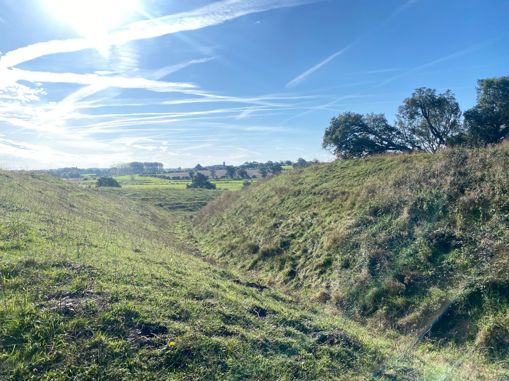 I’d seen the word ‘moat’ on the map – and obviously was fascinated but not too excited as so many of these moats have been ploughed out and not even a ghost mark remains. This was totally different. Walk past the sewage plant (not the moat in question) and into the next field and there it is. A complete moat, bank and platform.