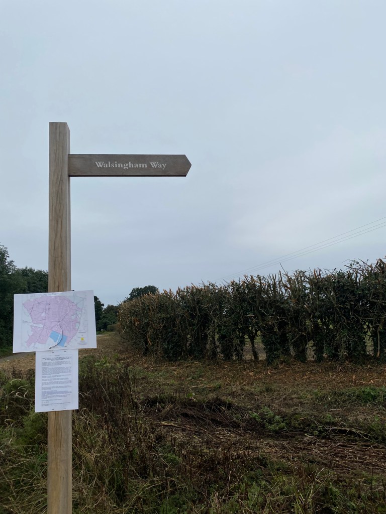 Find somewhere unobtrusive to park in Fulmodestone and set off down the Stibbard road. You will see a small road lead off to your right and opposite it a lane with the new ‘Walsingham Way’ marker. Take this path.