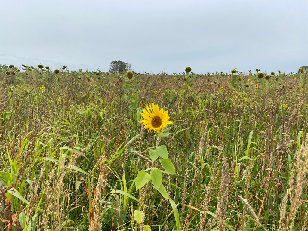 Leaving James and the chapel behind we turned left and followed the path along another lane until it opens up into fields. At the time of our walk the field was planted with sunflowers. They were past their best and just nodding brown seed-heads, interspersed with wild flowers – but a few patches of colour remained as ghost of the field would have been in high summer.