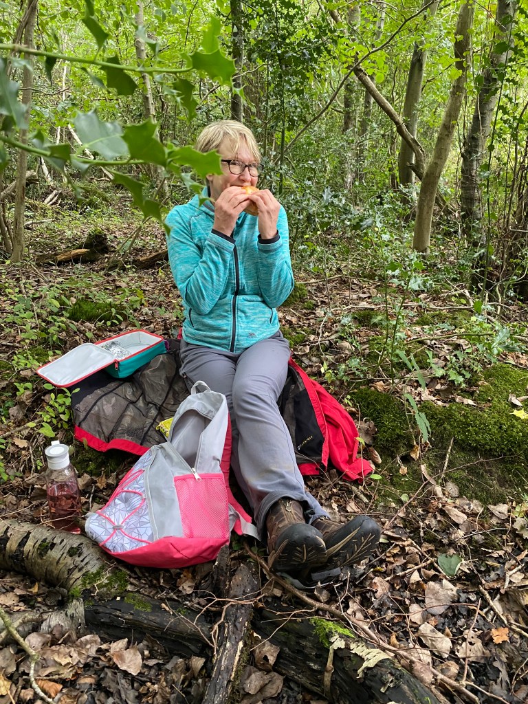 It was getting near lunchtime and the rain was coming down harder now and so we took a couple of steps from the path and down onto the woodland floor. Just taking yourself down a level and picking more dense tree cover will take a lot of the rain from you. We each found a log and sat, like slightly damp pixies, eating as many combinations of cheese as humanely possible. The cheese fest is growing with each walk and competitive cheese-eating is now a real thing.