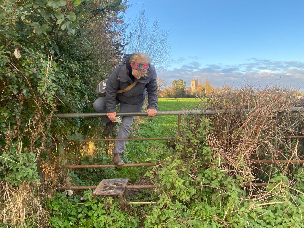 You can see Mattishall church in the background of this photo as Jane elegantly clambers over the stile. To get there, follow the footpath until it joins Mill Street. Turn right onto that road and it will take you back to the church.